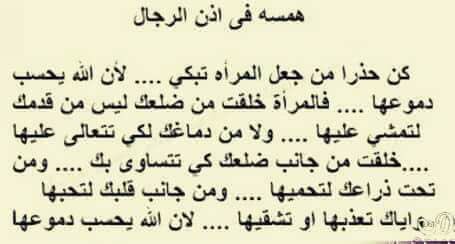 كن حذرا من جعل المرأة تبكي لأن الله يحسب دموعها فالمرأة خلقت من ضلعك و ليس من قدمك لتمشي عليها ولا من دماغك لكي تتعالى عليها خلقت المرأة من جانب ضلعك